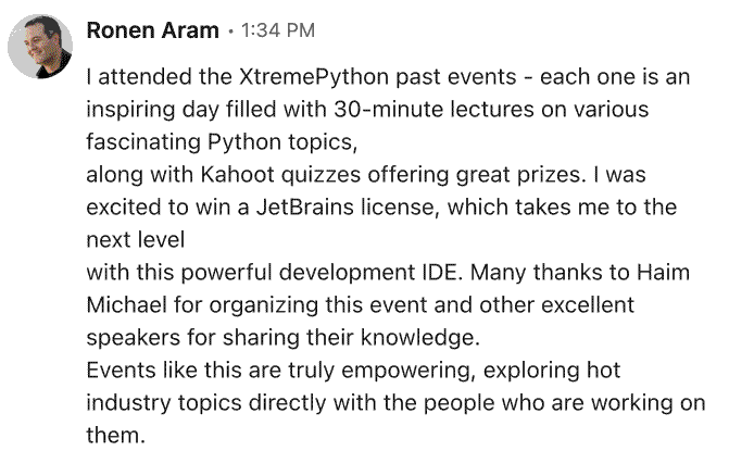 Discover why developers keep coming back to XtremePython! Attendees from past conferences have shared their excitement and appreciation across WhatsApp, LinkedIn, and beyond—praising the depth of knowledge, the inspiring talks, and the practical skills they gained. Their feedback speaks louder than any promotion: XtremePython delivers real value that makes a lasting impact. Here are just a few highlights from what participants had to say.